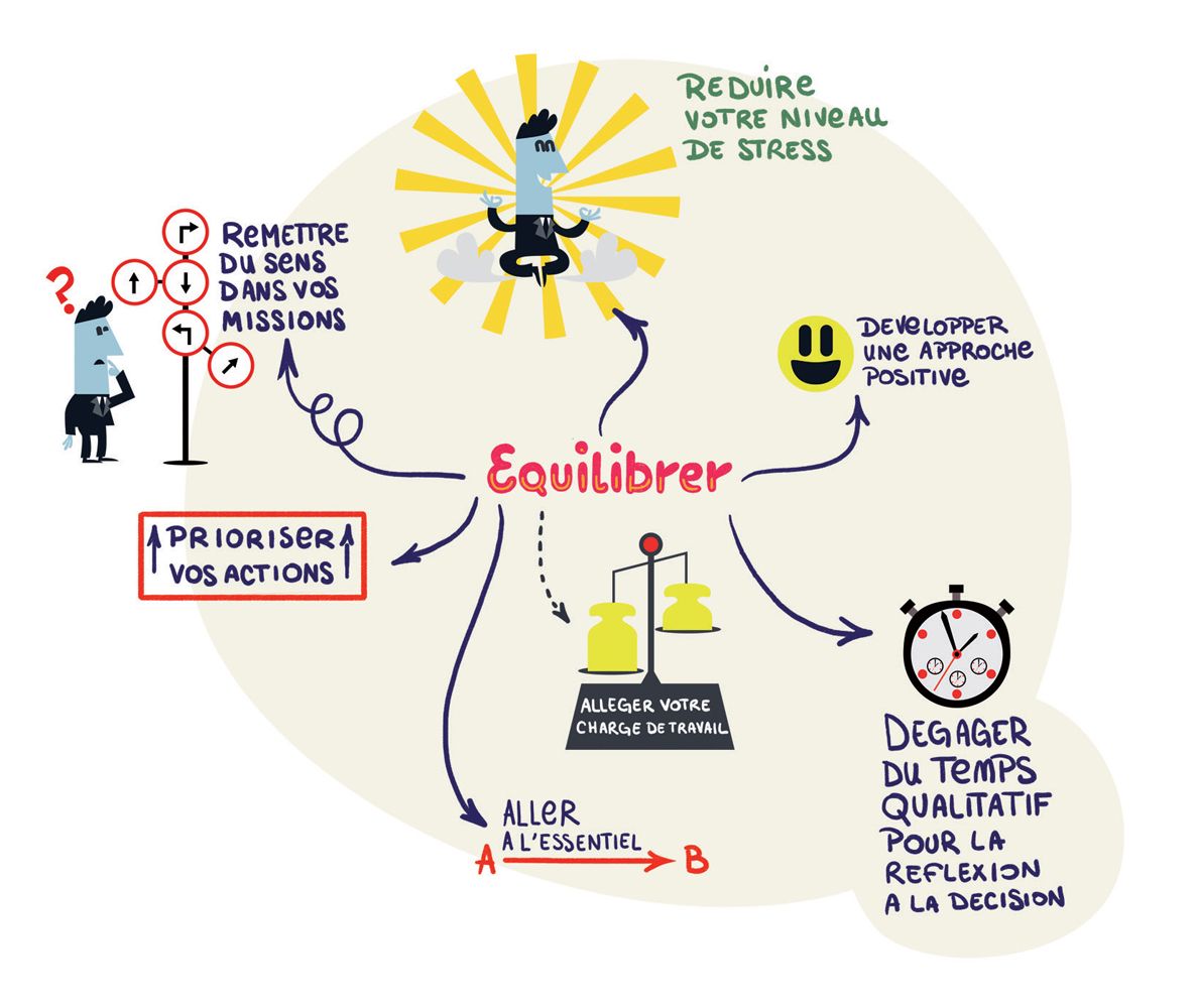 Le travail effectué au préalable dans la phase ‘Organiser’ est lié à la phase ‘Equilibrer’. Vous n’avez pas forcément assez de temps pour vous car souvent les blocages viennent de votre structure d’entreprise et pas forcément de votre organisation directe. Par la résolution de certains problèmes d’entreprise, nous allons résoudre directement les vôtres.