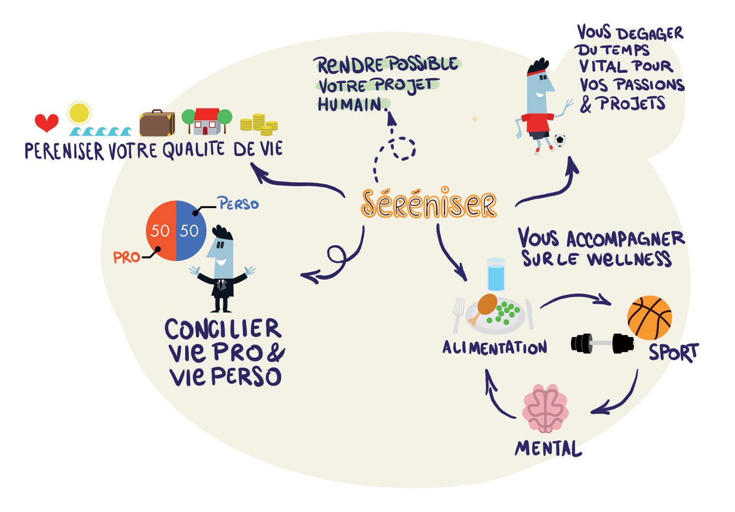 - Vous accompagnez également sur le « Wellness » c’est quoi ? Et bien, c’est s’occuper de votre santé. (Alimentation, sport, mental). Tous ces éléments donc a besoin un bon leader s’il veut être performant au quotidien. Pour cela, nous travaillons avec une cellule de développement du Wellness sur Biarritz, à Paris et en bretagne. Celle-ci est composé de sportif, médecin, nutritionniste, acuponcteur etc. Tout un corps médical dédié au bien-être.